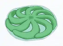 A few dozen fossil specimens are known, ranging from about 1 to 4 cm in diameter; they are circular in outline and their eight arms, with closed ends, spiral either clockwise or counterclockwise.[1] Ridges cut across both the inside and outside of the spiral arms.[1] The arms of the Australian individuals are longer and more tightly coiled than those of the Chinese, despite the Australian individuals not attaining as large a diameter; they are more often kinked.