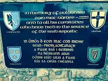 Following the years spent in the Curragh, McNamee emigrated to the United States. He moved first to Philadelphia before settling in the Chicago area, where he is supposed to have acted as the go-between for the IRA leadership and its weapons suppliers in the U.S. McNamee was another Irish man who took no time away from Army duties to marry. Even after he had established himself in the United States, first in Philadelphia and finally in Chicago. In 1969 when the IRA split between Official IRA and the Provisional IRA, he choose to side with the Provisionals.[8] He was said to be a close friend of fellow IRA man (and acquitted gun-runner) George Harrison.[9][1] A Sinn Féin cumann is named in his honor: Eoin McNamee Cumann, Kildress, Co. Tyrone. A monument to his memory stands at a quiet crossroads in the Sperrin Mountains of his native County Tyrone.