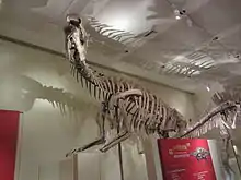 The preacetabular (i.e. located in front of the hip socket) process of the ilium bears a horizontal "boot" which forms an obtuse angle with the bottom of the process. Additionally, the top edge of the bone projects outwards to form a rim located above the ilium-ischium articulation on the bottom edge of the bone. These traits are also seen in Probactrosaurus and other iguanodonts.[3] The hip socket itself is quite large relative to the ilium for an iguanodont.[4] A distinctive flange is present along the top surface of the ilium, a trait which is shared with an unnamed hadrosauroid from the Woodbine Formation. The postacetabular (i.e. located behind the hip socket) process of the ilium tapers at its rear with no break in its top margin. On the pubis, the forward-projecting process expands towards the front, like Probactrosaurus, Gongpoquansaurus, and other iguanodonts. The shaft of the ischium is characteristically straight in adults (juveniles have a curved shaft, which is more common among iguanodonts), and the bottom of the shaft bears a compressed "boot" that is expanded forwards.[3][8]