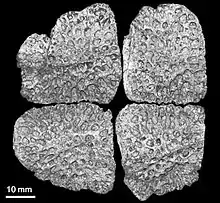 A second species, Eosuchus minor, was actually discovered earlier in 1870 by Othniel Charles Marsh, but was assigned to the genus Gavialis. The Gavialis minor holotype specimen YPM 282 consisted of cranial fragments and isolated vertebrae found from the Manasquan Formation in Monmouth County, New Jersey, dating back to the Ypresian stage of the early Eocene. The species name minor refers to the relatively small estimated size of the animal, estimated at no more than 2 meters, when compared to other gavialoids such as the modern gharial, which can grow up to 5 meters in length. However, this species was later recognized as distinct from Gavialis on the basis of certain aspects of the known cranial material, in particular the large foramen aerum of the quadrate formed from the epithelial tube that connects the pneumatic chambers of the quadrate and articular. Another diagnostic feature thought to distinguish the species from Gavialis was the narrow interfenestral bar of the parietal bone that is relatively smooth and unsculptured when compared to other gavialoids such as Thoracosaurus. The new generic name Thecachampsoides was proposed for the species G. minor in 1986.[3] A close relationship between T. minor and Eosuchus lerichei was always evident, yet it was not until 2006 that the name Eosuchus was applied to the T. minor specimens, specifically on the basis of a fairly complete specimen called NJSM 15437 from the Vincetown Formation in New Jersey, of which there is a visibly exposed braincase which aids greatly in the taxonomic classification of the genus. The examination of specimens of Thecachampsoides minor with those of Eosuchus lerichei yielded many similarities between the two species, including the foramen aerum as well as other features such as a long nasal process between the premaxillae, dentary alveoli arranged in pairs, and a W-shaped basioccipital tuberosity. E. minor differs from E. lerichei on the basis of a noticeably wider nasal and prefrontals positioned anteriorly further up the skull than the lacrimals.[4]