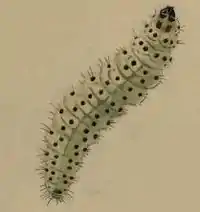 The larvae feed on bur-chervil (Anthriscus caucalis), Athamanta cretensis, wild carrot (Daucus carota), baldmoney (Meum athamanticum), Peucedanum species, burnet-saxifrage (Pimpinella saxifraga), villous deadly carrot (Thapsia villosa) and spreading hedgeparsley (Torilis arvensis neglecta).[5] They initially mine the leaves of their host plant. Young larvae make several small, full depth blotch mines. The mines are mostly found in the apical part of the composite leaves. Older larvae live externally on the plant under a slight web, although on host plants with fleshy leaves, the larvae may complete their development within the mine. Larvae can be found from May to June and again from August to September. They are translucent yellowish green with a darker dorsal line and black or brown spots and a black head.[3]