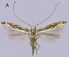 The wingspan is 9.2–11 mm. The forewings are brown with a narrow white band on the dorsum from the base to two-thirds of the entire length. There are three pairs of white bands beginning at the costal and dorsal margins near 1/2 to three-fourths length of the wing and extending obliquely toward the wing apex, terminating before reaching mid-width of the wing. There is a narrow silver band with metallic reflection extending from the costa to the dorsum at five-sixths length and the distal one-sixth is orange-brown with a black dot centrally, franked by a short white spot or band near the costa and dorsum. The distal end fringed with a narrow white band. The hindwings are brown.