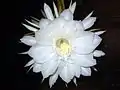 The flowers are nocturnal. They grow on flattened stems and are up to 30 cm (12 in) long and 17 cm (7 in) wide, and very fragrant. The principal odor components in the aroma are benzyl salicylate and methyl linoleate.[5] Pericarpels are nude, slightly angled, and green. Bracteoles are short and narrow up through ca. 10 millimetres (1.0 cm) long. Receptacles are up through 20 cm long, 1 cm thick, brownish, and arching. The outer tepals are linear, acute, 8–10 cm long, and reddish through amber. The inner tepals are whitish, oblanceolate or oblong, acuminate, up through 8–10 cm long and 2.5 centimetres (25 mm) wide. The stamens are greenish white or white, slender and weak. The styles are greenish white, pale yellow, or white, 4 mm thick, as long as inner tepals, and with many lobes.