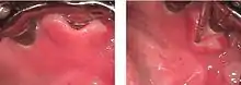 Epulis fissuratum is a benign hyperplasia of fibrous connective tissue which develops as a reactive lesion to chronic mechanical irritation produced by the flange of a poorly fitting denture.[1] More simply, epulis fissuratum is where excess folds of firm tissue form inside the mouth, as a result of rubbing on the edge of dentures that do not fit well. It is a harmless condition and does not represent oral cancer. Treatment is by simple surgical removal of the lesion, and also by adjustment of the denture or provision of a new denture.