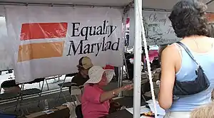 - In 2007, EQMD launched a statewide visibility campaign, Marylanders For Marriage, to increase public support for same-sex marriage.[10][11] The campaign, featuring the motto "Civil Marriage is a Civil Right," included the launch of a website, promotion at gay pride festivals and other events, and the distribution of yard signs and bumper stickers across the state.[11][12]