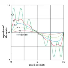 The ancient Greeks, in particular Hipparchus, knew the equation of the center as prostaphaeresis, although their understanding of the geometry of the planets' motion was not the same.[2] The word equation (Latin, aequatio, -onis) in the present sense comes from astronomy. It was specified and used by Kepler, as that variable quantity determined by calculation which must be added or subtracted from the mean motion to obtain the true motion. In astronomy, the term equation of time has a similar meaning.[3] The equation of the center in modern form was developed as part of perturbation analysis, that is, the study of the effects of a third body on two-body motion.[4][5]
