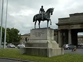 Stapleton Cotton, 1st Viscount Combermere (1773–1865) was a cavalry officer, diplomat and politician, who served with distinction under Wellington in the Peninsular War.[1] In 1863 it was suggested that a monument to him should be erected. The proposal quickly gained support from the major landowners of Cheshire and John Graham, Bishop of Chester, who were all major subscribers to the project. It was agreed, because of Combermere's distinguished cavalry career, that the monument should be an equestrian statue. Carlo Marochetti, noted for his equestrian statues, was commissioned to create the work. It was also agreed that the statue should stand on a prestigious site opposite Chester Castle. Work began in 1864 but, before the work could be completed, Combermere died in February 1865. The statue was unveiled on 26 October 1865 and cost about £5,000 (equivalent to £510,000 in 2021).[2] Around £7,000 had been raised from the subscriptions, and the difference was given to charitable causes. It was the first major piece of open-air public sculpture to be erected in Cheshire.[3]