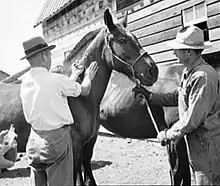 Over vast areas, barbed wire is often seen in some parts of the world, but it is the most dangerous fencing material that can be used around horses, even in a large pasture. If a horse is caught in barbed wire, it can quickly become severely hurt, often leaving lasting scars or even permanent injuries. Horse management books and periodicals are nearly universal in stating that barbed wire should never be used to contain horses.[2] However, this advice is widely ignored, particularly in the western United States.