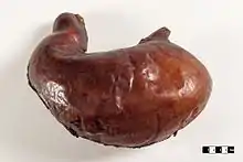 The cecum is the first section of the large intestine. It is also known as the "water gut" or "hind gut". It is a cul-de-sac pouch,[16] about 1.2 m (4 ft) long that holds 26 to 30 L (7 to 8 US gal). It contains bacteria that digest cellulose plant fiber through fermentation.[17] These bacteria feed upon chyme digestive, and also produce certain fat-soluble vitamins which are absorbed by the horse.[14] The reason horses must have their diets changed slowly is so the bacteria in the cecum are able to modify and adapt to the different chemical structure of new feedstuffs.[16] Too abrupt a change in diet can cause colic, as the new food is not properly digested.