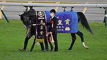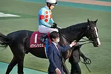 As announced, Equinox entered the Tenno Sho on October 30, where he started favourite. After making a good start, he was in the middle of the pack chasing Panthalassa, who was running at a high pace of 57.4 seconds/1000 meters. As the horse entered the final stretch, Lemaire urged the horse forward, catching Panthalassa at the last second, covering what Lemaire said was at least 15 lengths with the speed of 32.7 seconds over the last 3 furlongs,[17] marking his first GI victory. This was the second year in a row, and the fifth ever, where a three-year old won the Autumn Tenno Sho, with Efforia being the previous year's winner. Equinox's win also marked the fastest win in any horse's career as he was the first horse to have won the race after running just five races, and also became the first flat G1 race of the season where the most favored horse won the race, breaking the spell after 16 consecutive losses for the most favored.[18][19] Equinox's victory also marked the first GI victory of any Kitasan Black sire, and the fourth parent-child pair ever to win the same Autumn Tenno Sho Race.[18] During the post-race interview Lemaire commented "Spring was unlucky for him, but I was able to show the true Equinox" and "this may be his first GI, but this won't be the last. I believe he can still win more GI titles".[20]