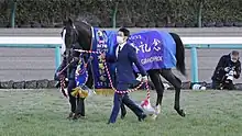 At the Arima Kinen, Equinox was the most favored.[23] After the race began, he was in the rear of the pack that was chasing Titleholder. Just before the third corner Equinox started to move on to the outside, and started to pick up the pace as he made the fourth corner. At the final stretch, after Lemaire urged the horse to go faster, he picked up even more pace and crossed the finishing pole, not letting any other horses come near him. This victory marked the 21st horse ever to win the Arima as a three year old, and a second year in a row after Efforia last year. Equinox also became the third horse ever to win both the Tenno Sho (Autumn) and Arima as a three-year old, and the fastest ever for any horse to win the Arima with just six races to his career.[24][25] This race also became the first Arima since 1994 for the top two to be won by a three-year old, as Boldog Hos was also a three-year old.[26]