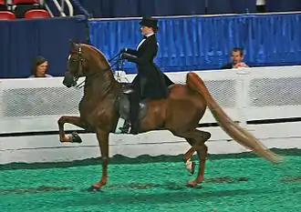 Gaits shown in Saddle Seat classes include the walk, trot, and canter. Some competitions may call for extended gaits, particularly the trot. When showing a Tennessee Walking Horse they will be required to perform a flat walk and running walk. Some class will also require a canter. All classes require Rail work, where competitors show and are judged as a group going both ways of the arena. Saddle seat equitation may include individual tests or a pattern to be ridden. Tests may include backing up, mounting and dismounting, riding without stirrups, "addressing" the reins (i.e. picking up the four or two reins correctly), figure eights, serpentines and straight line patterns done at any gait. At the canter, only simple changes of lead are required when changing directions. It is possible to have a "ride-off," where two or more riders are asked to perform additional work to determine the winner.