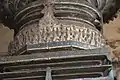 The architectural style of the temple is close to Ramappa temple and Kota Gullu, other Kakatiya era temples. The temple is placed on an upapitha and is cruciform in shape.[14][15] It has three porticos in the east, north and south and a garbhalaya in the west. The sikhara on the inner sanctum (garbhagudi) is made of brick and lime and is decorated all over by miniature turrets. It is said that the stone used in temple construction has interesting acoustic properties. When the temple stone is tapped with a coin, it sounds like metal.[15] The temple has intricately carved pillars and walls. The temple walls are painted with frescoes.