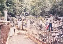 Since motorable access was not available at that time, labourers climbed with all materials such as sand, metal, cement, steel etc. for a 460 m elevation from the powerhouse location to the weir location.