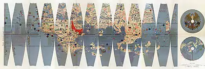 listen)) is a terrestrial globe produced by Martin Behaim from 1490–1492. The Erdapfel is the oldest surviving terrestrial globe. It is constructed of a laminated linen ball in two halves, reinforced with wood and overlaid with a map painted on gores by Georg Glockendon.[1] The map was drawn on paper, which was pasted on a layer of parchment around the globe.[2]