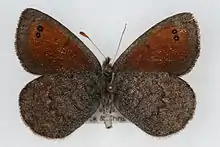 The wingspan is 35–38 mm. The upperside is dull gray brown with a slight luster. Two eyespots are near the tip both above and below on the forewing. These are usually located in a red patch. The underside of the hindwing is silver gray with very small dark markings.[2]