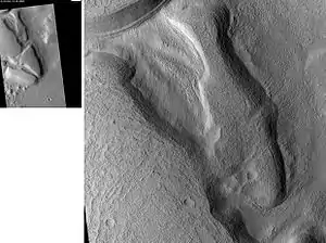 ![]() Erebus Montes, as seen by HiRISE. Grooves indicate movement. | |