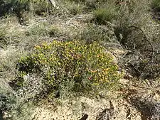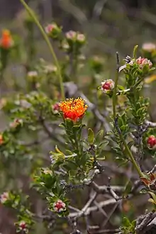 The flowers are orange-coloured, on the ends of the previous year's wood and occur singly or rarely, two together. There are 5 sepals which are densely hairy on the outside surface and 5 petals 4–6 millimetres (0.16–0.24 in) long. The stamens, which give the flower its colour, are arranged in 5 bundles, each containing 16 to 36 stamens. Flowering occurs from July to November and is followed by fruits which are woody capsules. The capsules are 6.9–8 millimetres (0.27–0.31 in) long, more or less cup-shaped, rough and lumpy with the remains of the sepals giving a star-like appearance to the end.[2] It can be distinguished from other eremaeas by the rough fruits and the presence of 5 or more veins on the leaves.