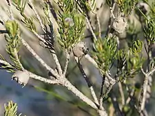 Eremaea ectadioclada is a low, spreading shrub growing to a height of 0.7 metres (2 ft). Its younger branches are densely covered with fine hairs. The leaves are 4–10 millimetres (0.2–0.4 in) long, 0.4–2.0 millimetres (0.02–0.08 in) wide, narrow egg-shaped, tapering to a point. There is a single vein, sometimes three veins visible on the lower surface.[2]
