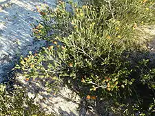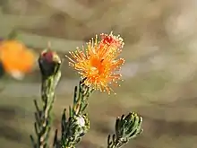 The flowers are orange-coloured and occur singly or (rarely) in pairs, on the ends of the longer branches which grew in the previous year. There are 5 sepals which are densely covered with hairs on the outside surface and 5 petals 4–6 millimetres (0.16–0.24 in) long. The stamens, which give the flower its colour, are arranged in 5 bundles, each containing 16 to 36 stamens. Flowering occurs from July to November and is followed by fruits which are woody capsules. The capsules are 6.9–8.0 millimetres (0.27–0.31 in) long, rough and scaly on the outer surface and more or less barrel-shaped or cup-shaped. This species can be distinguished from other eremaeas by its rough, usually star-shaped fruit and narrow leaves.[2]