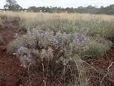 The silvery-grey foliage of this eremophila complements the blue flowers of this hardy, small shrub. It can be propagated from cuttings or by grafting onto Myoporum rootstock. It prefers a well-drained soil in a sunny location but will develop a more open habit in partial shade. It is very drought tolerant and moderately resistant to frost.[10]
