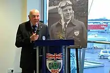 After announcing his retirement from motor racing Thompson concentrated on his work at Lloyd's. He resigned his job in the 1980s and opened a bookshop near Guildford, selling rare books on the history of motor racing.[11][12] Thompson also made occasional appearances at historic festivals.[3] He became the first driver to be inducted into the Le Mans Drivers Hall of Fame in 2013. He has 3 Sons Micheal (b.1963),John (b.1969) and Peter (b.1970) he had 5 Grandsons Eric Junior (b.1999), Lewis (b.2002), Eddie (b.2009), Stewart (b.2011) and Kyle (b.2014) [13]