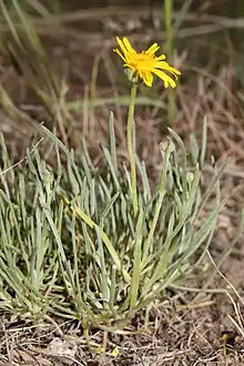 Erigeron linearis is a small clumping perennial herb reaching a maximum height of 20 centimeters (8 inches), with a woody taproot. Its leaves are long and narrow, mostly clustered around the base of the stem, and are 2 to 9 cm (3โ4 to 3+1โ2 in) long and greenish-white. The erect, somewhat hairy, leafless stems usually produce only one flower head (though occasionally 2 or 3) each about 1 cm (3โ8 in) wide. It has a center of many golden yellow disc florets and a fringe of as many as 38 pale to bright yellow or cream-colored ray florets.[3]