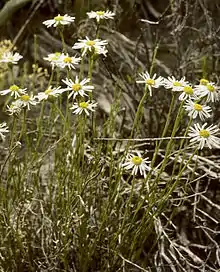 Erigeron rhizomatus was thought to be a New Mexico endemic until 1999, when some plants were found over the border in Arizona.[1] These are located in the Chuska Mountains on the Navajo Nation, and they occur in 15 populations that make up one metapopulation.[5] The two previously known metapopulations in New Mexico are composed of 24 populations in the Zuni, Datil, and Sawtooth Mountains.[5] These three metapopulations are geographically isolated from each other but are still similar in morphology.[5]