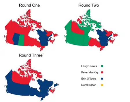 O'Toole won the leadership election after three rounds were counted, replacing Andrew Scheer. His victory was attributed partially to his pitch to socially conservative voters including supporters of candidates Derek Sloan and Leslyn Lewis to mark him as their second or third choice.[53][54] He generally performed better in Conservative- and Bloc Québécois-held ridings, in rural areas, and in areas with fewer visible minorities. Despite representing a riding on the eastern edge of the Greater Toronto Area, O'Toole performed poorly there.[55] People's Party leader Maxime Bernier criticized him in remarks dismissed by fellow leadership candidate Sloan, stating that he was not a real conservative.[56]