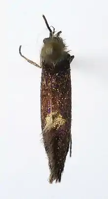 The wingspan is about 1 centimetre. The adult moths are golden coloured with purple markings with prominent yellow triangular patch on the tornus. The head is covered with golden hairs.[2] Flies in the sunshine in April and May amongst birches.[3]