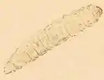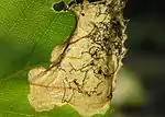 The larvae are whitish with a pale brown head and mine the leaves of birch (Betula species) in May and June. The mine starts as a corridor, usually near the mid-rib and gradually widens to a blotch.[5] Eriocrania sparrmannella has a similar looking mine, but feeds from mid-June to August.[6]