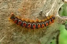 Eriogaster lanestris, commonly known as the small eggar, is a moth of the family Lasiocampidae that is found across the Palearctic. Unlike many other members of the Lasiocampidae, the small eggar is a social insect. Historically, only eusocial insects like ants, bees, and termites were thought to exhibit complex social organization and communication systems. However, research since the late 20th century has found that E. lanestris, among a number of other phylogenetically related moth and butterfly species, demonstrates social behaviors as well. Larvae spend nearly their entire development in colonies of about 200 individuals, and this grouped social structure offers a number of benefits, from thermoregulation to increased foraging success.[1]