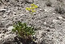 This wild buckwheat species produces erect stems up to 20 centimeters tall and bearing inflorescences of many tiny bright yellow flowers in headlike clusters or cymes. The base of the plant is surrounded by a mat of green leaves growing on the branching caudex.[2]