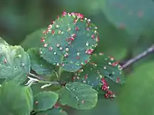 Species of tree galled include common alder (Alnus glutinosa), grey alder (Alnus incana) & subsp. rugosa + tenuifolia, x pubescens, red alder (Alnus rubra) and green alder (Alnus alnobetula).[4] Leaves are occasionally infected by both this species and Eriophyes inangulis. Identification of gall mites on alder is tentative and the mites need to be examined for positive identification.[3]