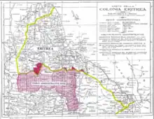 In March 1870, an Italian shipping company became a claimant to the territory at the northern end of Assab Bay, a deserted but spacious bay about half-way between Annesley Bay to the north and Obock to the south.[12] The area —which had long been dominated by the Ottoman Empire and Egypt was not settled by the Italians until 1880.[13] In 1884, the Hewett Treaty was signed between the British Empire and Ethiopia, reigned by Emperor Yohannes IV (r. 1871–1889). The British Empire promised the highlands of modern Eritrea—and free access to the Massawan coast to Ethiopia in exchange for its help evacuating garrisons from the Sudan, in the then-ongoing Mahdist War.[14] In 1889, the disorder that followed the death of Yohannes IV, Italian General Oreste Baratieri occupied the highlands along the Eritrean coast and Italy proclaimed the establishment of a new colony of "Eritrea", (from the Latin name for the Red Sea), with its capital at Asmara in substitution for Massawa.[15] On 2 May 1889, the peace and friendship Treaty of Wuchale was signed between Italy and Ethiopia, under which Italian Eritrea was officially recognised by Ethiopia as part of Italy.[16] However, Article 17 of the treaty was disputed, as the Italian version stated that Ethiopia was obliged to conduct all foreign affairs through Italian authorities (in effect making Ethiopia an Italian protectorate), while the Amharic version gave Ethiopia considerable autonomy, with the option of communicating with third powers through the Italians.[17][18][19] This resulted in the First Italo-Ethiopian War,[20] which the Ethiopians won, resulting in the Treaty of Addis Ababa in October 1896. Italy paid reparations of ten million Italian lira. Unusually, the Italians retained most, if not all, of the territories beyond the Mareb-Belessa and May/Muni rivers that they had taken, with Emperor Menelik II (r. 1889–1913) giving away part of Tigray.[21][22] On 2 August 1928, Ethiopia and Italy signed a new friendship treaty.[23]