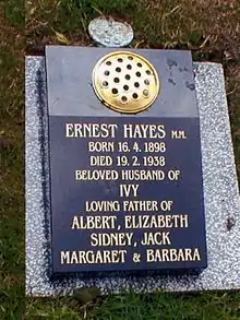Ernest Hayes died on 19 February 1938, at the age of just 39. He is buried in Beeston cemetery, Nottinghamshire. His grave remained unmarked until 2005, when his youngest daughter Barbara, with the help of the Royal British Legion, placed a memorial stone upon his grave.