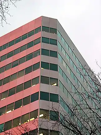 Throughout the 1960s, the City of Winnipeg conducted transport studies which led to a rethinking of traffic flow through Portage Avenue and Main Street, the city's hub, and had Smith Carter conduct the transit forecast studies which concluded that mixing pedestrian and vehicular traffic would no longer be viable, ultimately leading to the construction of an underground concourse replacing the four sidewalks of the corner.[19] Significant or large scale works during this period include the Canadian Wheat Board and Grain Commission buildings (1962 and 1970, respectively), the Royal Bank of Canada and Bank of Canada buildings (1965 and 1971), the Pan Am Pool (1967), and the Manitoba Centennial Centre (1967–1972).[note 2] One of the firm's most identifiable works from the period, and "one of the most identifiable landmarks of the city" is the Richardson Building[9] (1967–1969; with Skidmore, Owings and Merrill as consulting architects),[20] It forms the anchor of the Lombard Place development, which includes the Winnipeg Inn (1970, currently the Fairmont Hotel) and the underground concourse later connected to Trizec's Winnipeg Square shopping mall (1979)[20] and the Commodity Exchange Tower (1974-1979, often referred to as the "Trizec Building" locally).[21] Other large scale projects included the Woodsworth Building on Broadway (1973), The Great-West Life Assurance Company (1983), and the Air Canada building (1985).[6]