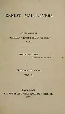 Ernest Maltravers is an 1837 novel by the British writer Edward Bulwer-Lytton, originally published in three volumes. It is Gothic in style, and features a protagonist combining "Byronic stature and Coleridgean philosophical ambition".[1] It was followed by a sequel Alice.[2]