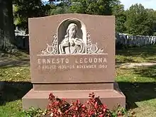 In 1960, thoroughly unhappy with Castro's new régime, Lecuona moved to Tampa, Florida and lived on West Orient Street in West Tampa with his relative, singer Esperanza Chediak. Lecuona lived his final years in the US, but while traveling in the Canary Islands three years later, he died of a heart attack in the town of Santa Cruz de Tenerife on November 29, 1963, where he was trying to recuperate from a lung ailment.[2] He was interred at Gate of Heaven Cemetery in Hawthorne, New York, but his will instructs that his remains be repatriated once the current régime runs its course. A great deal of Lecuona's music was first introduced to mass American audiences by Desi Arnaz, a fellow Cuban and Lucille Ball's spouse.