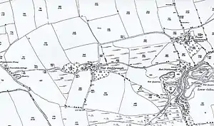 In 1773 the mansion house was a ruin, with only a tower remaining.[11] In 1902 "Irishborough manor house" was the property of Rev. Henry Tubal Hole, Rector of Plympton St. Maurice.[40] The site is today covered by the central settlement of "West Irishborough", which in the 18th century had the status of barton[41] or principal farm, and to the east on the edge of the historic curvi-linear estate, "Tower Farm",[8] believed to have been the site of the mansion house[42] of the Mules family.