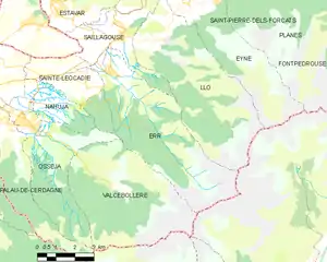 Err is located in the canton of Les Pyrénées catalanes and in the arrondissement of Prades. Err station has rail connections to Villefranche-de-Conflent and Latour-de-Carol.