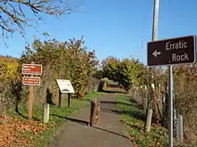 In addition to the boulder, the hilltop features views of the Oregon Coast Range and the valley, including vineyards and farms.[6][8][26] There is a 0.2-mile (320 m) hike along a paved trail to the top of the hill past a vineyard and orchard that provides bird watching opportunities.[9][10] Operated by the state parks department, the park is a day use only facility that includes an interpretive sign and picnic table at the 4.4-acre (2 ha) park.[2][5]
