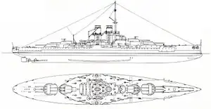 The displacement for the Ersatz Monarch class was to be 24,500 metric tons (24,100 long tons) per ship.[10][30][31][32] The overall length of each ship should would have been 172 to 175.2 meters (564 ft 4 in to 574 ft 10 in), with a beam of 28.5 meters (93 ft 6 in), and a draft of 8.4 meters (27 ft 7 in).[31][32] Each battleship was to be manned by a crew of 1,050 to 1,100 officers and men.[9][31]