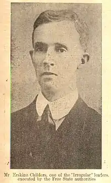 Robert Erskine Childers DSC (25 June 1870 – 24 November 1922), usually known as Erskine Childers[2][3][4] (/ˈɜːrskɪn ˈtʃɪldərz/[5]), was an English-born Irish writer, politician, and militant. His works included the influential novel The Riddle of the Sands. Starting as an ardent Unionist, he later became a supporter of Irish Republicanism and smuggled guns into Ireland in his sailing yacht Asgard. He was executed by the authorities of the nascent Irish Free State during the Irish Civil War. He was the son of British Orientalist scholar Robert Caesar Childers; the cousin of Hugh Childers and Robert Barton; and the father of the fourth President of Ireland, Erskine Hamilton Childers.