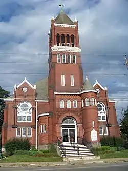 The Erste Deutsche Evangelische Kirche, also known as First United Church of Christ, is located at 160 Madison Avenue, Elmira, New York. Construction of the church started in 1898, and finished the following year. The church served the large German American population of Elmira. It is significant for its Rhenish Romanesque architecture. The church and its parsonage were listed on the National Register of Historic Places in 2007.[2]