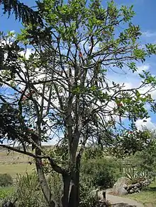 Erythrina edulis is a vigorous, fast-growing precocious legume species, and is considered one of the easiest trees to grow. As it is sensitive to the cold, it grows only in the tropics and is not suitable for temperate regions. Optimum temperatures are between 15 and 22 °C (59 and 72 °F)),[3] and it grows in a broad range of altitudes (from 900-3200 a.s.l.). In its native habitat, the average annual precipitation varies between 450 and 1,800 mm (18 and 71 in).[1] Erythrina edulis grows best in well-drained soils with a sandy or clayey texture and a pH ranging from 5.5 to 7.[3] Erythrina edulis is a totipotent plant and thus propagates easily. Hence, stems can be cut and planted into the soil and will sprout. Propagation can also be achieved by planting mature seeds and in most cases they germinate easily. Grafting is another possibility; the advantage is that seed production will start earlier. The seeds must be planted very soon after harvesting because they lose their viability 8 days after harvesting. The viability can be extended to 20 days when the seeds are covered in a thin paraffin layer.[4] Erythrina edulis produces a raceme of red flowers, which are pollinated by bees, wasps and birds.[2] The ripening of the seeds is not synchronized. The tree can live for decades and the older it gets, the more grain it will produce. A three- to four-year-old tree can produce about 30 kg (66 lb) of grain per year, while a 20-year-old tree reaches 120 to 210 kg (260 to 460 lb) of grain per year.[5] Thanks to the symbiosis with Rhizobium bacteria, Erythrina edulis can fix atmospheric nitrogen and therefore does not need any additional nitrogen fertilizer.