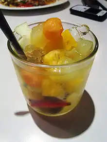 Es buah is an Indonesian iced fruit cocktail dessert. This cold and sweet beverage is made of diced fruits, such as honeydew, cantaloupe, pineapple, papaya, squash, jackfruit and kolang kaling (Arenga pinnata fruit), mixed with shaved ice or ice cubes, and sweetened with liquid sugar or syrup. The type of fruit used in this dessert may vary, some might add any available fruits such as mango, watermelon or longan — some imported fruits — such as lychee, kiwi, strawberry, pear, peach or grapes. Other ingredients might be added too, such as agar-agar jelly, grass jelly, seaweed or nata de coco.