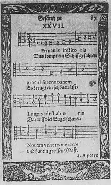 ![]() "Uns kompt ein Schiff gefahren", Andernacher Gesangbuch, Cologne 1608, oldest evidence of the song | |