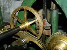 Designed in 1895 by Frank Hope-Jones, the Synchronome switch and gravity escapement were the basis for the majority of their clocks in the 20th century.[71] And also the basis of the slave pendulum in the Short-Synchronome free pendulum clock.[72] A gathering arm attached to the pendulum moves a 15-tooth count wheel in one position, with a pawl preventing movement in the reverse direction. The wheel has a vane attached which, once per 30-second turn, releases the gravity arm. When the gravity arm falls it pushes against a pallet attached directly to the pendulum, giving it a push. Once the arm has fallen, it makes an electrical contact that energises an electromagnet to reset the gravity arm and acts as the half-minute impulse for the slave clocks.[73]