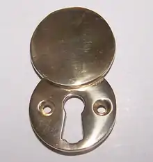 An escutcheon can also refer to an item of door furniture. In this case, it is an architectural item that surrounds a keyhole or lock cylinder, and is often part of a lockset. Escutcheons help to protect a lock cylinder from being drilled out or snapped, and to protect the surrounding area from damage and wear from the end of the key when it misses the keyhole.[1]